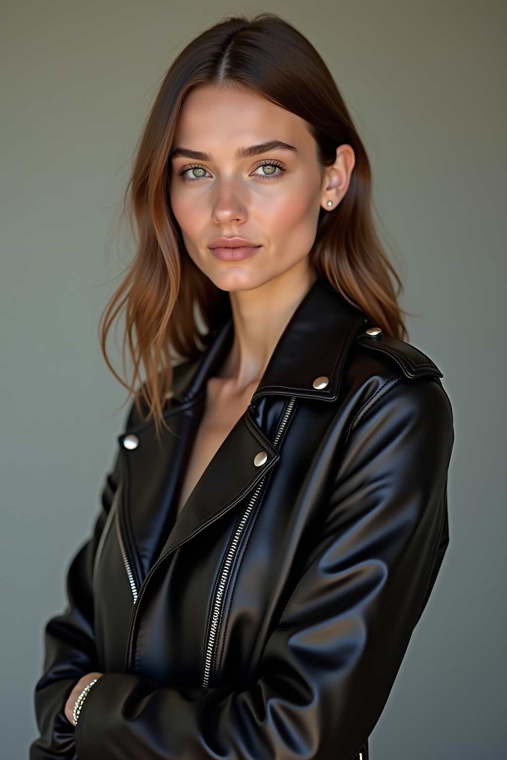 Materialkontrast: Kombiniere die strukturierte Lederjacke mit weichen, fließenden Stoffen wie Seide oder Chiffon für einen spannenden Materialkontrast.