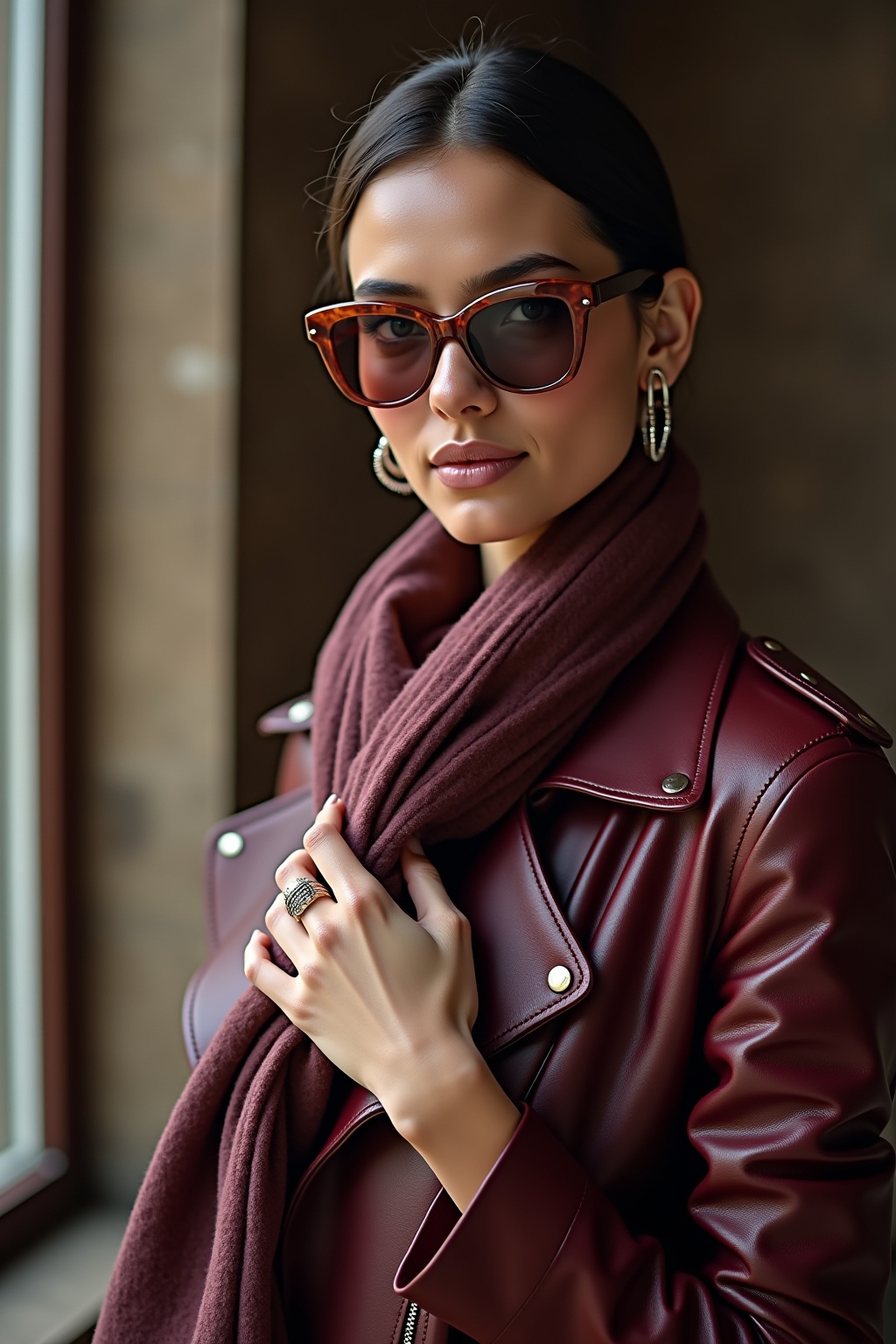 Perfekte Accessoire-Kombination: Goldschmuck und schwarzer Schal ergänzen Bordeaux-Lederjacken optimal durch den Kontrast zwischen Wärme und Kühle.