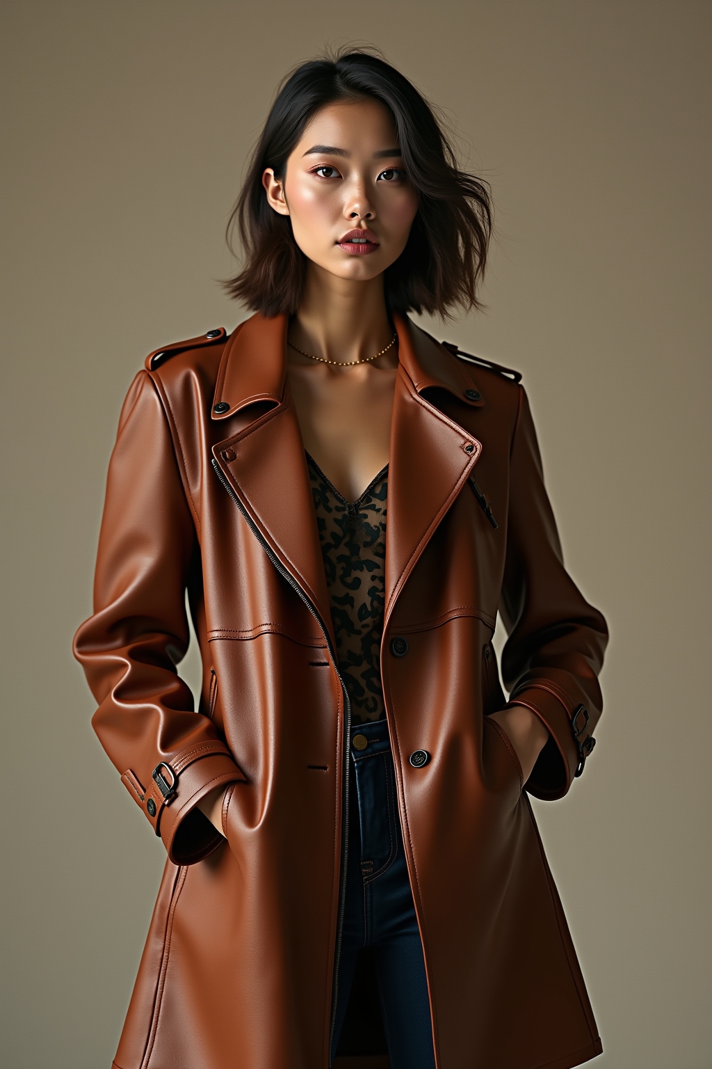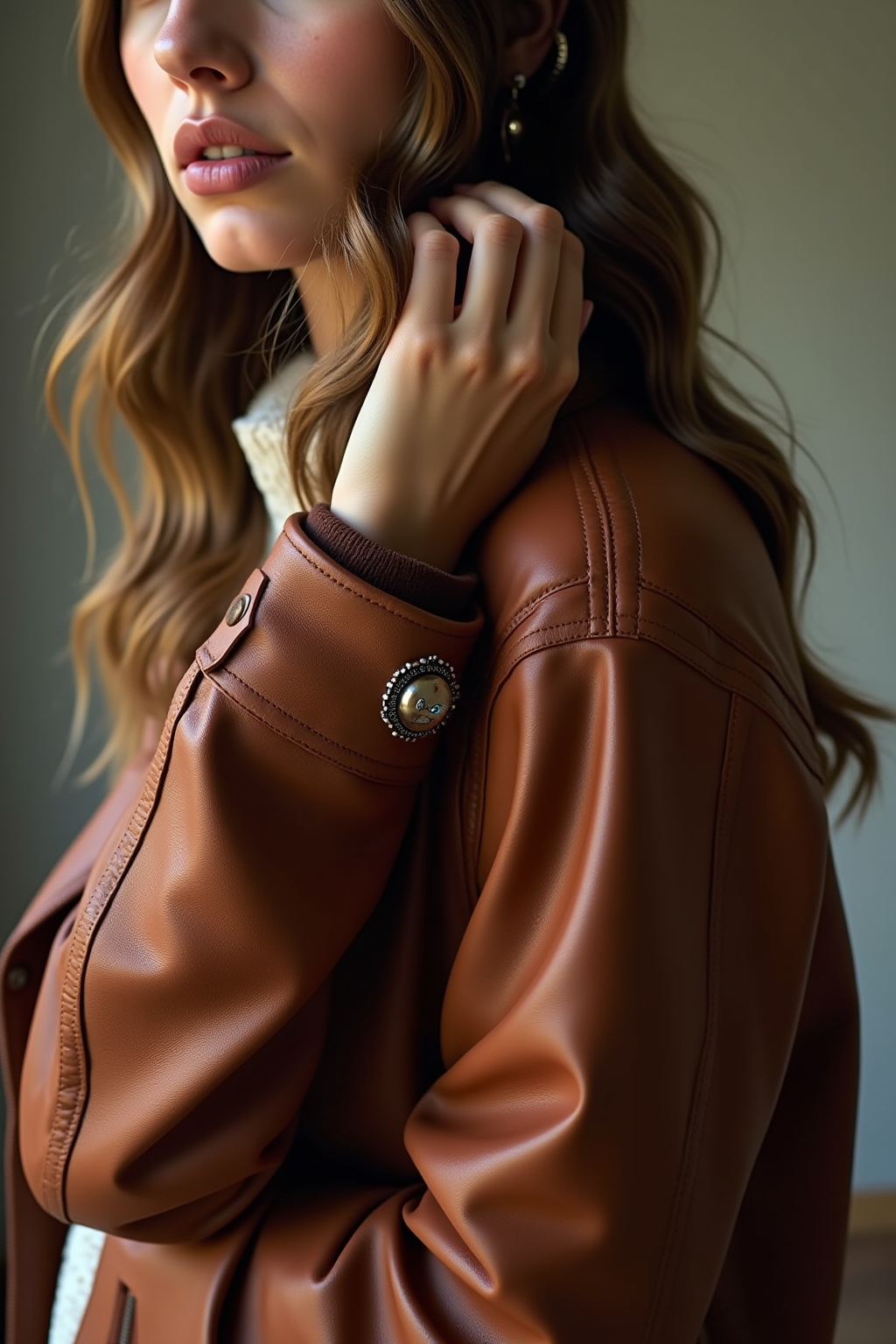 Goldschmuck und Naturtöne ergänzen braune Lederjacken optimal und verstärken den warmen Charakter.