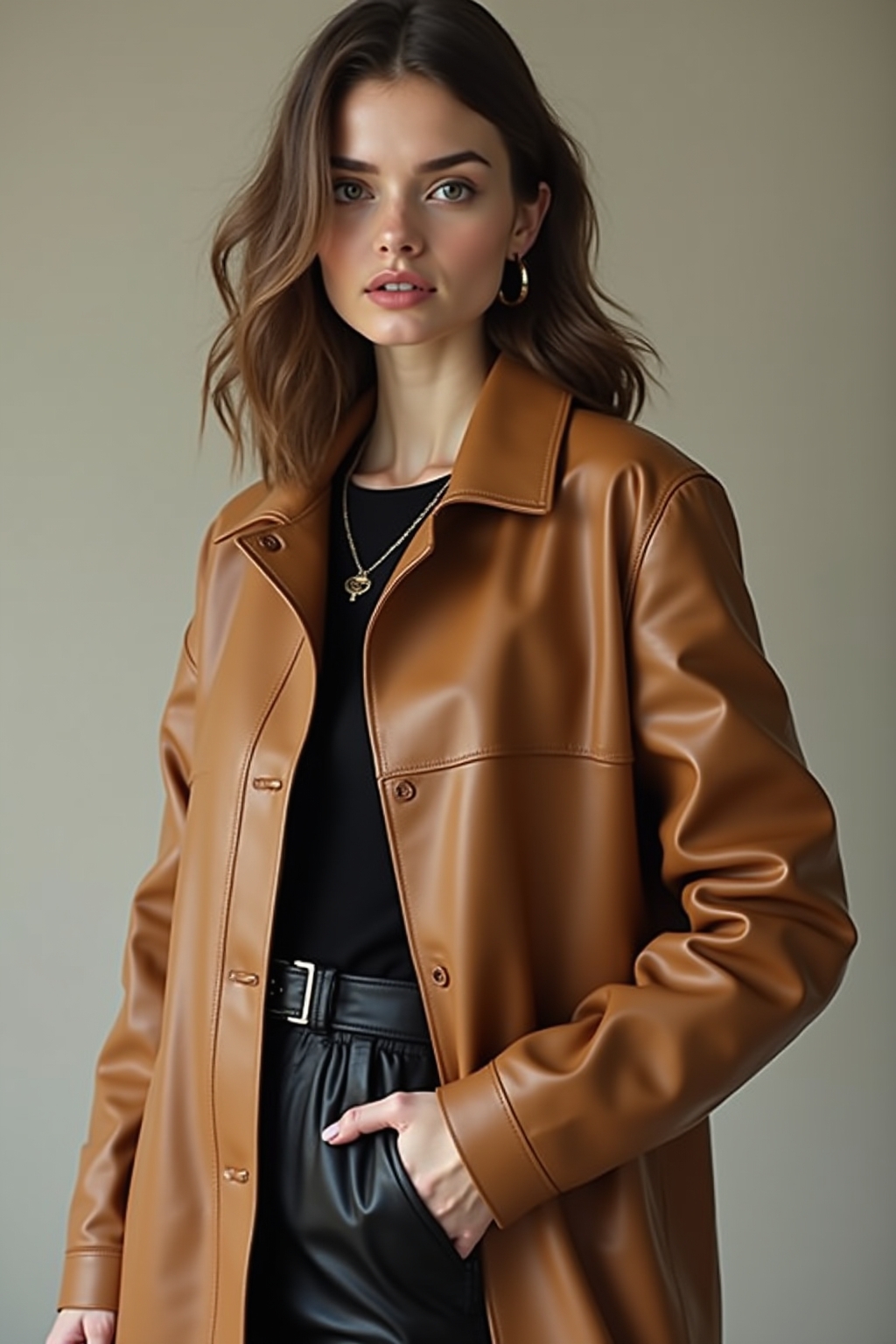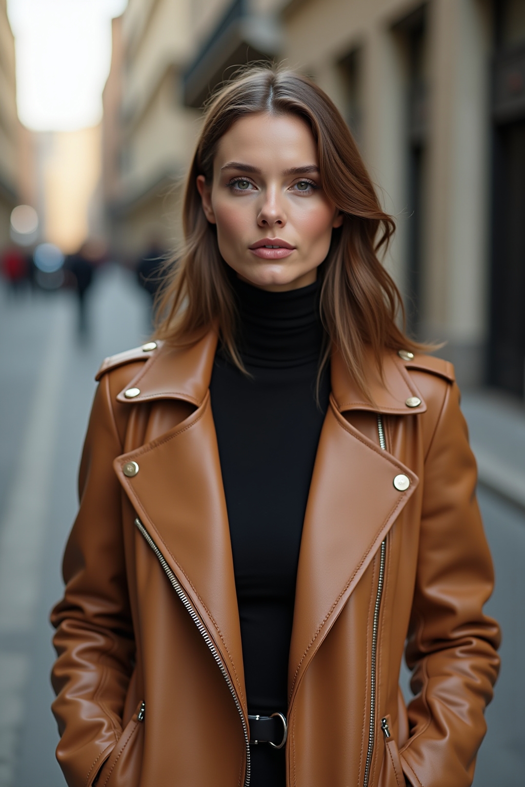 Eine Camel-Lederjacke ist der perfekte Mittelpunkt für ein stilvolles Damen-Outfit, das sowohl Eleganz als auch Charakterstärke ausstrahlt. Die warme, zeitlose Farbe lässt sich mühelos mit verschiedenen Elementen kombinieren und verwandelt selbst schlichte Basics in einen durchdachten Look. Mit ihrer weichen Textur und dem edlen Farbton verkörpert die Camel-Lederjacke die perfekte Balance zwischen lässigem Chic und femininer Souveränität, die jede Garderobe auf ein neues Niveau hebt.