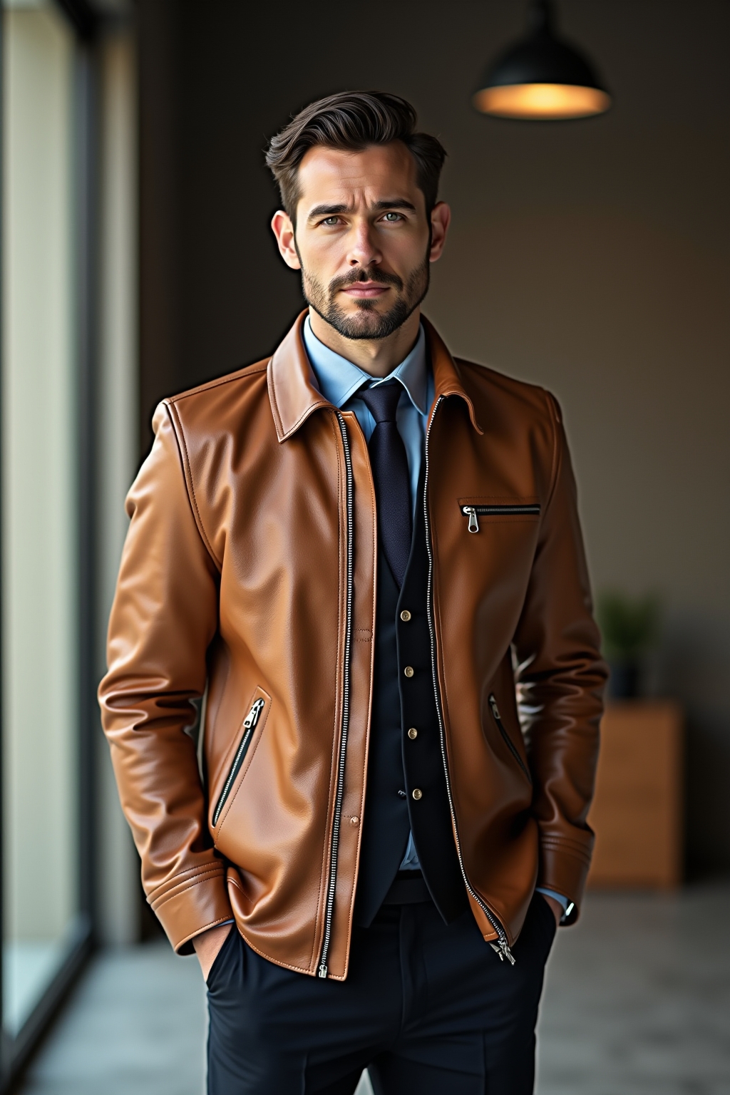 So kombinieren Herren ihre Camel-Lederjacke für den Business-Look