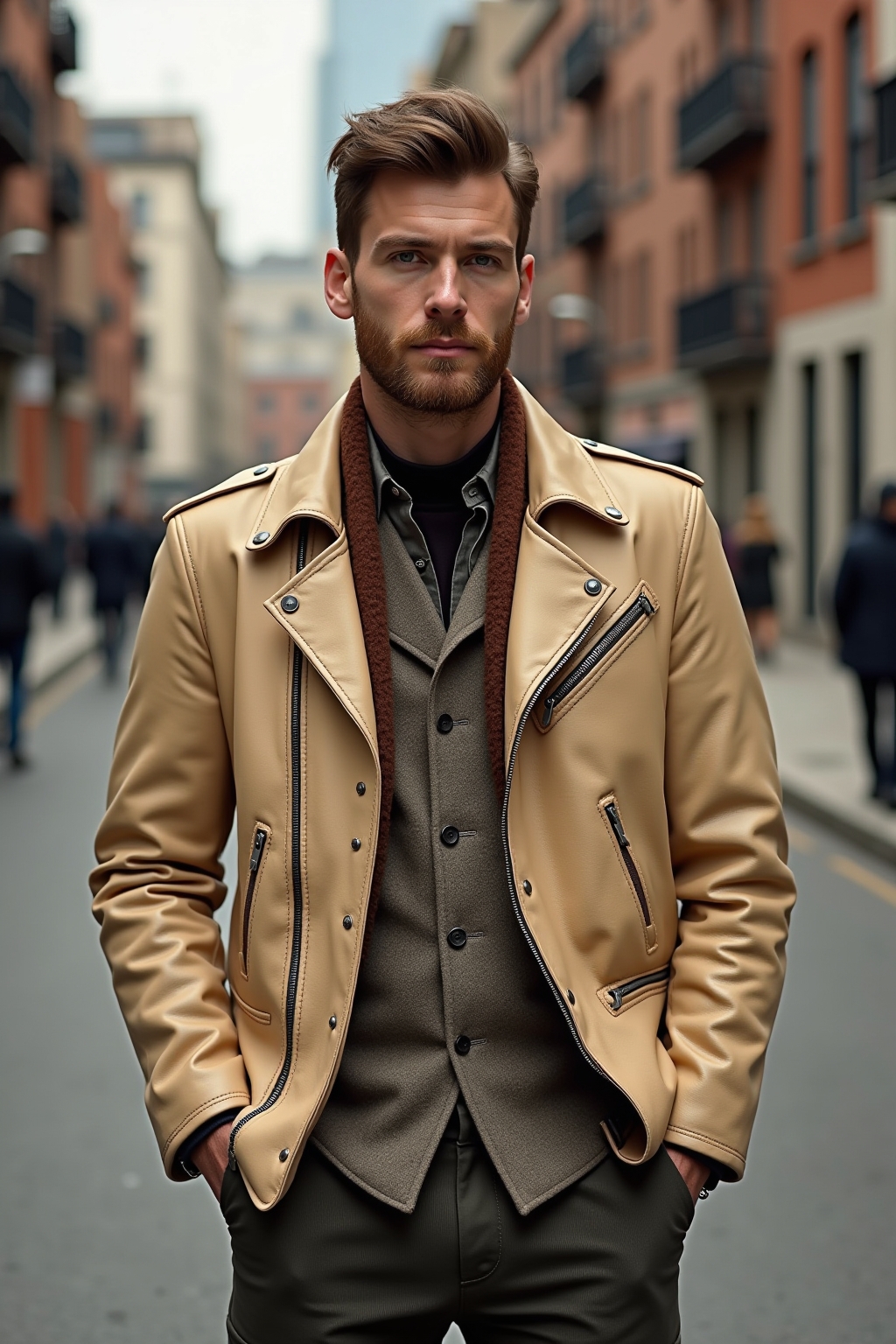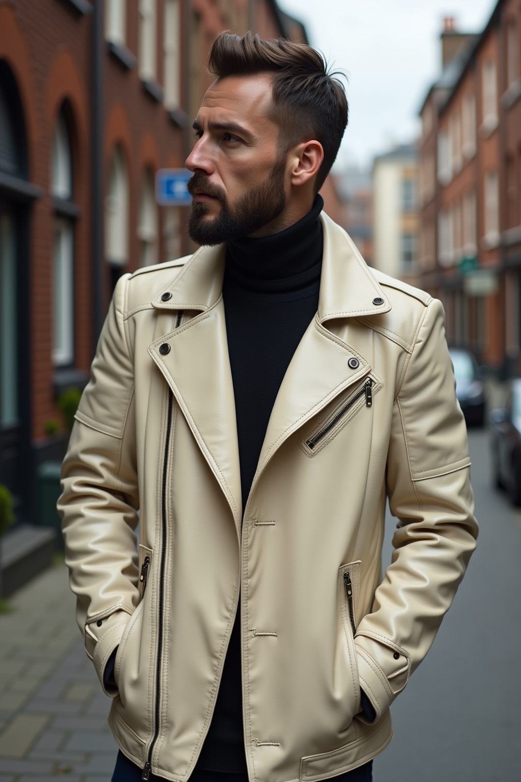 Der Trend zu cremefarbenen Lederjacken entspricht der aktuellen Bewegung zu helleren, natürlicheren Farbtönen in der Herrenmode.