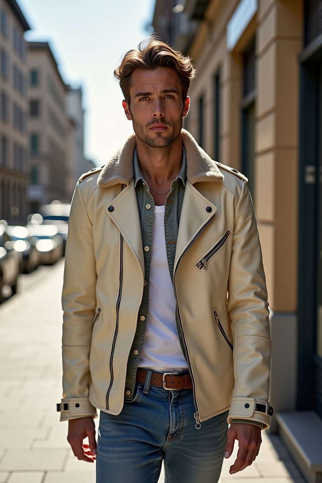 Eine cremefarbene Lederjacke ist für Herren ein außergewöhnliches Statement-Piece, das Eleganz und Lässigkeit perfekt vereint. Im Gegensatz zur klassischen schwarzen oder braunen Variante strahlt die helle Farbgebung eine besondere Frische aus und verleiht jedem Outfit eine raffinierte Note. Ob für den Übergang zwischen den Jahreszeiten oder als stilvoller Begleiter an kühleren Sommerabenden – die cremefarbene Lederjacke bietet vielseitige Kombinationsmöglichkeiten, die jeden modebewussten Mann begeistern werden.