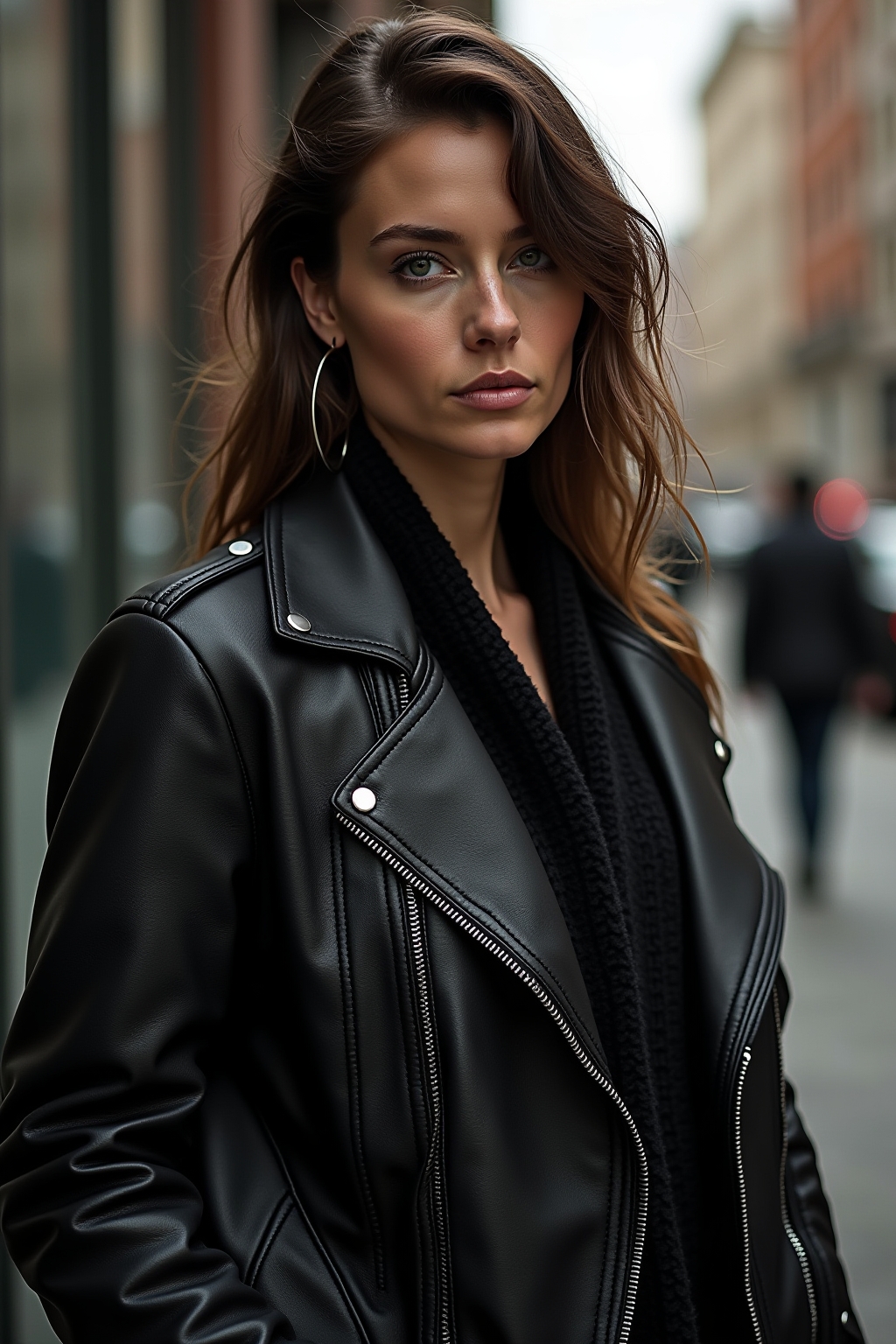 Die schwarze Lederjacke ist ein wahrer Allrounder im Kleiderschrank. Für einen lässigen Alltags-Look kombiniere sie mit Jeans und einem weißen T-Shirt oder Hoodie. Für elegantere Anlässe passt die Bikerjacke hervorragend zu einem schmalen schwarzen Kleid oder einer schicken Bluse mit Stoffhose. Im Büro wirkt die Lederjacke über einem Hemd oder einer Bluse mit Chinohose oder Bleistiftrock professionell, aber nicht zu formell. Die Vielseitigkeit des Leatherjackets zeigt sich auch bei Dates oder Abendveranstaltungen, wo sie mit einer Seidenhose oder über einem Cocktailkleid für einen edgy-eleganten Stilbruch sorgt.