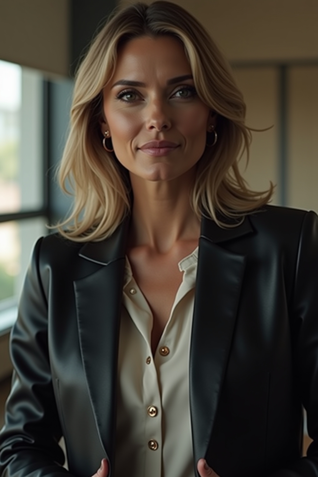 Perfekte Kombination: Elegante Blusen, hochwertige Pullover und klassische Stoffhosen oder Röcke harmonieren ideal mit Lederjacken im Büro.