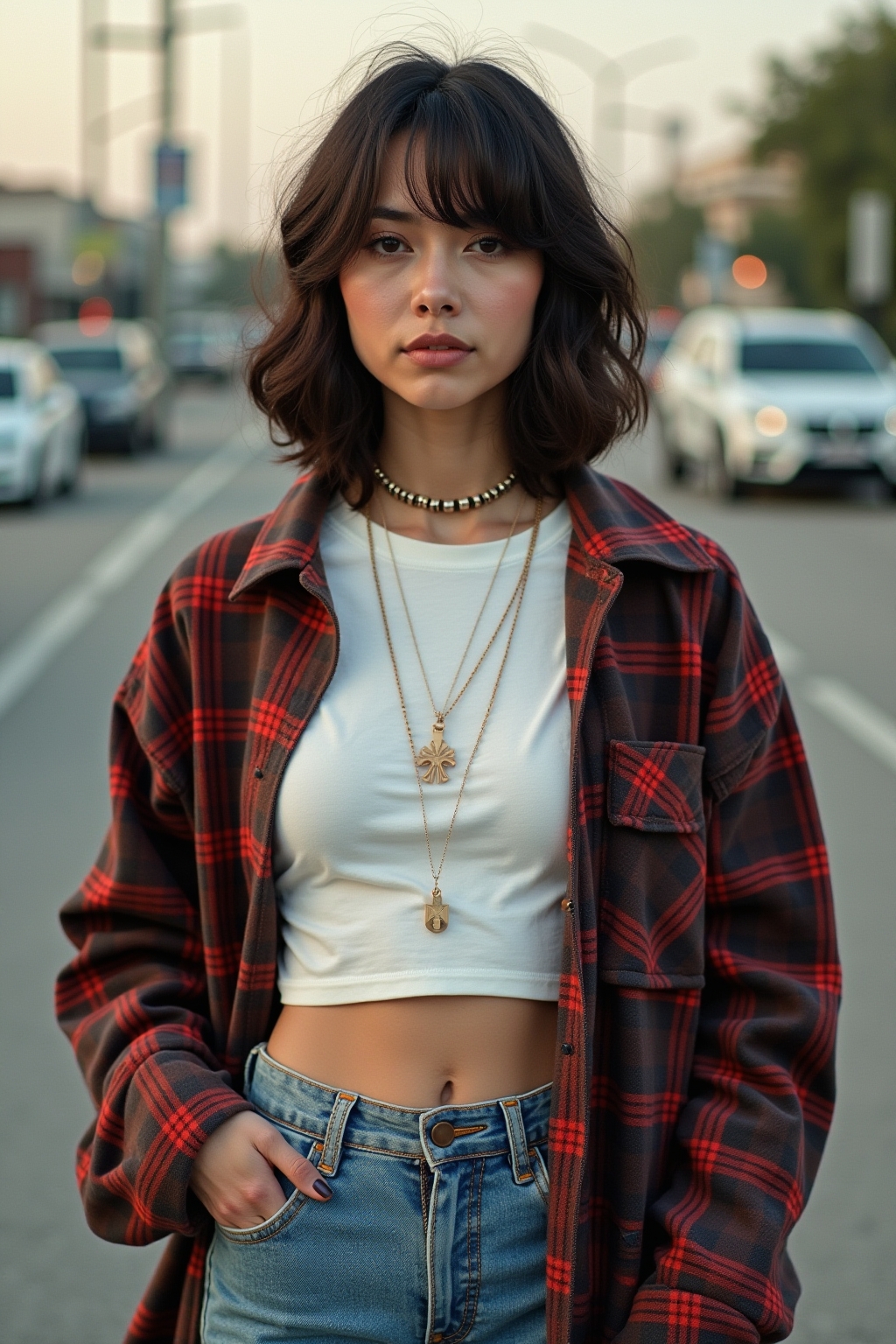 Ein authentisches 90er Jahre Damen-Outfit besteht aus mehreren charakteristischen Elementen: Bauchfreie Tops oder Crop-Tops, High-Waist-Jeans, Overalls aus Jeansstoff, Plateauschuhe oder Buffalo Boots und Choker-Halsketten sind absolute Must-haves. Flanellhemden, oft überdimensioniert getragen, wurden durch Grunge-Bands wie Nirvana populär. Slip-Dresses, am besten mit T-Shirt darunter, waren besonders gegen Ende des Jahrzehnts beliebt. Auch Schlaghosen, Miniröcke mit Strumpfhosen und bunte Scrunchies als Haaraccessoires vervollständigen den Look. Die Kleidung war oft in knalligen Neonfarben oder mit auffälligen Mustern versehen – je ausgefallener, desto besser.